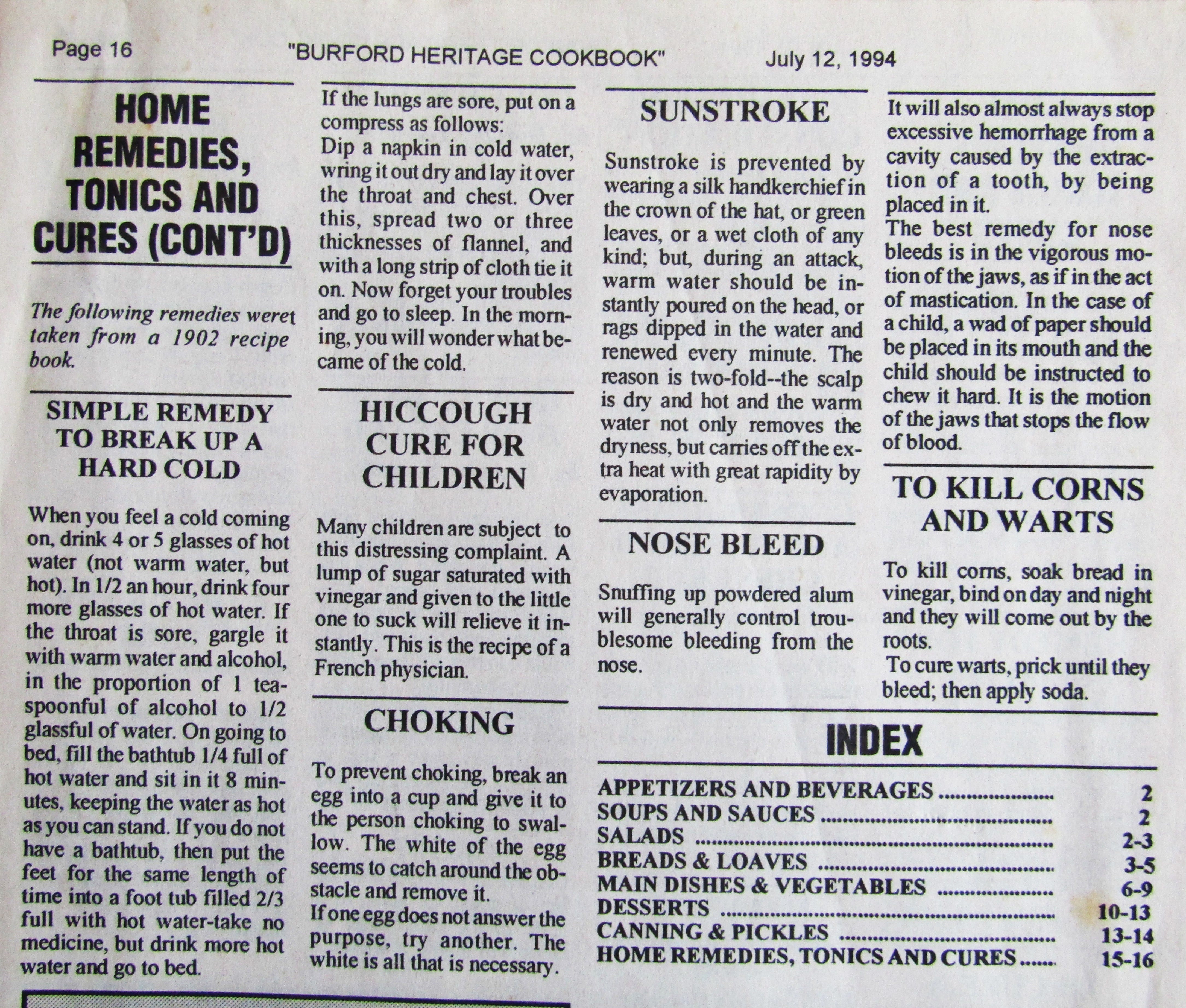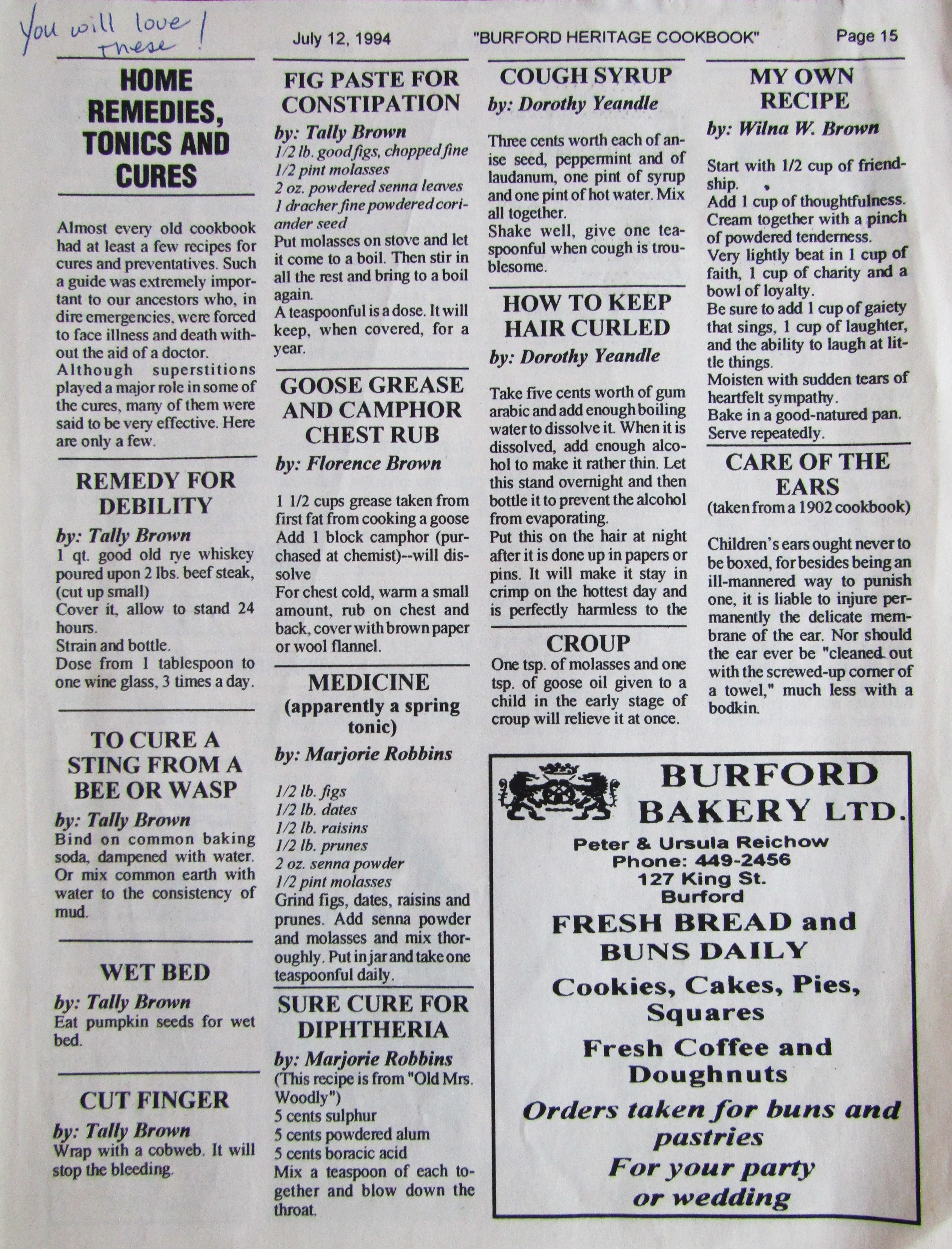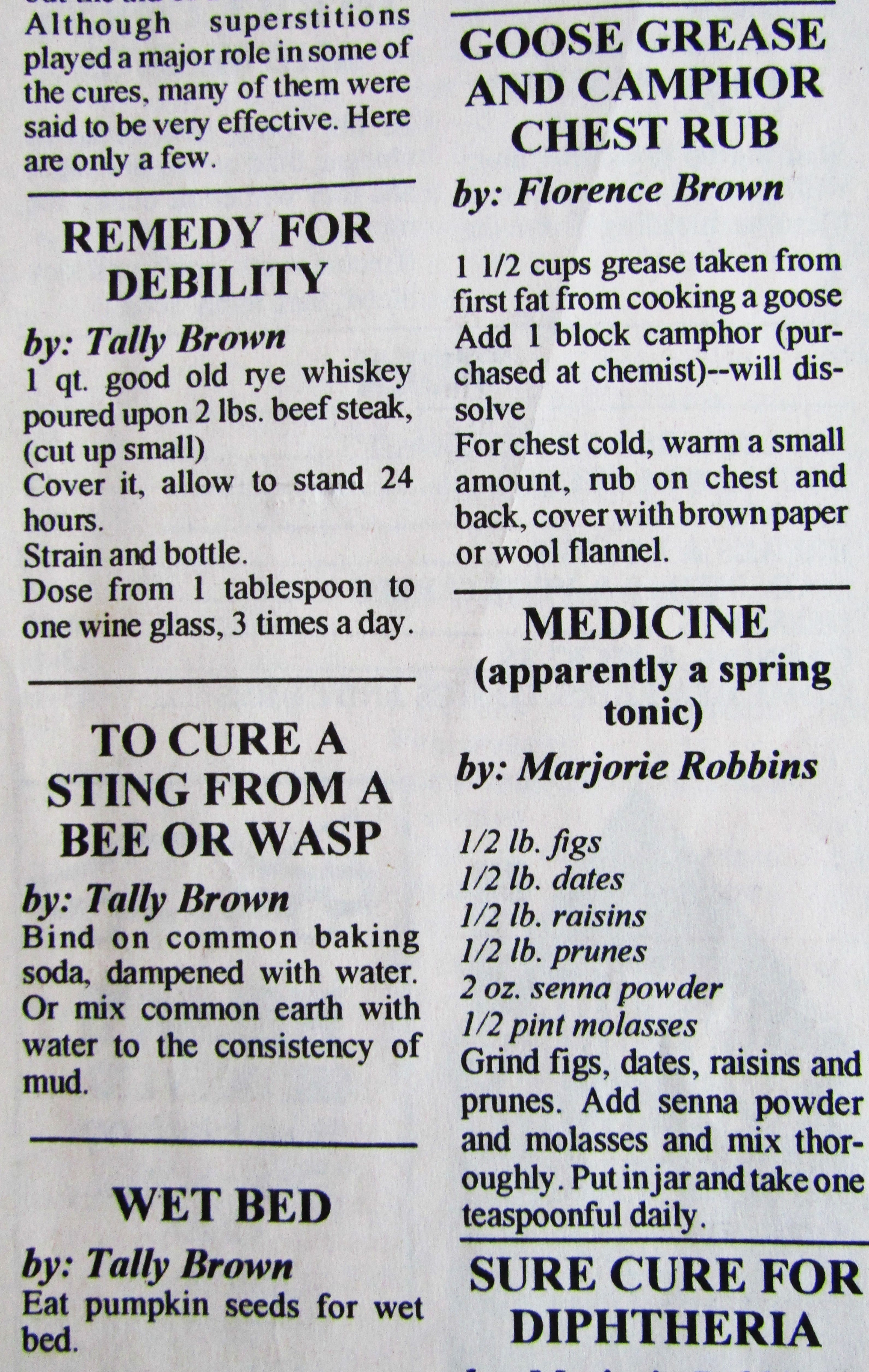My mom wrote on the top of another page (also from the Burford Heritage Cookbook), “You’ll love these!” The recipes listed under Home Remedies, Tonics and Cures makes me wonder how anyone survived. It seems like cholera or the Spanish flu would have been a better option over the likes of the Remedy for Debility. One quart of “good ole rye whiskey” poured over two pounds of beef steak (*cut up small). This was to stand for 24 hours before being strained into a bottle and administered in a questionable dose of one teaspoon or a wine glassful three times a day. It sounds like drinkable steak tartare. And if you piss the bed afterwards (see “WET BED”, well, the old wives suggest pumpkin seeds.