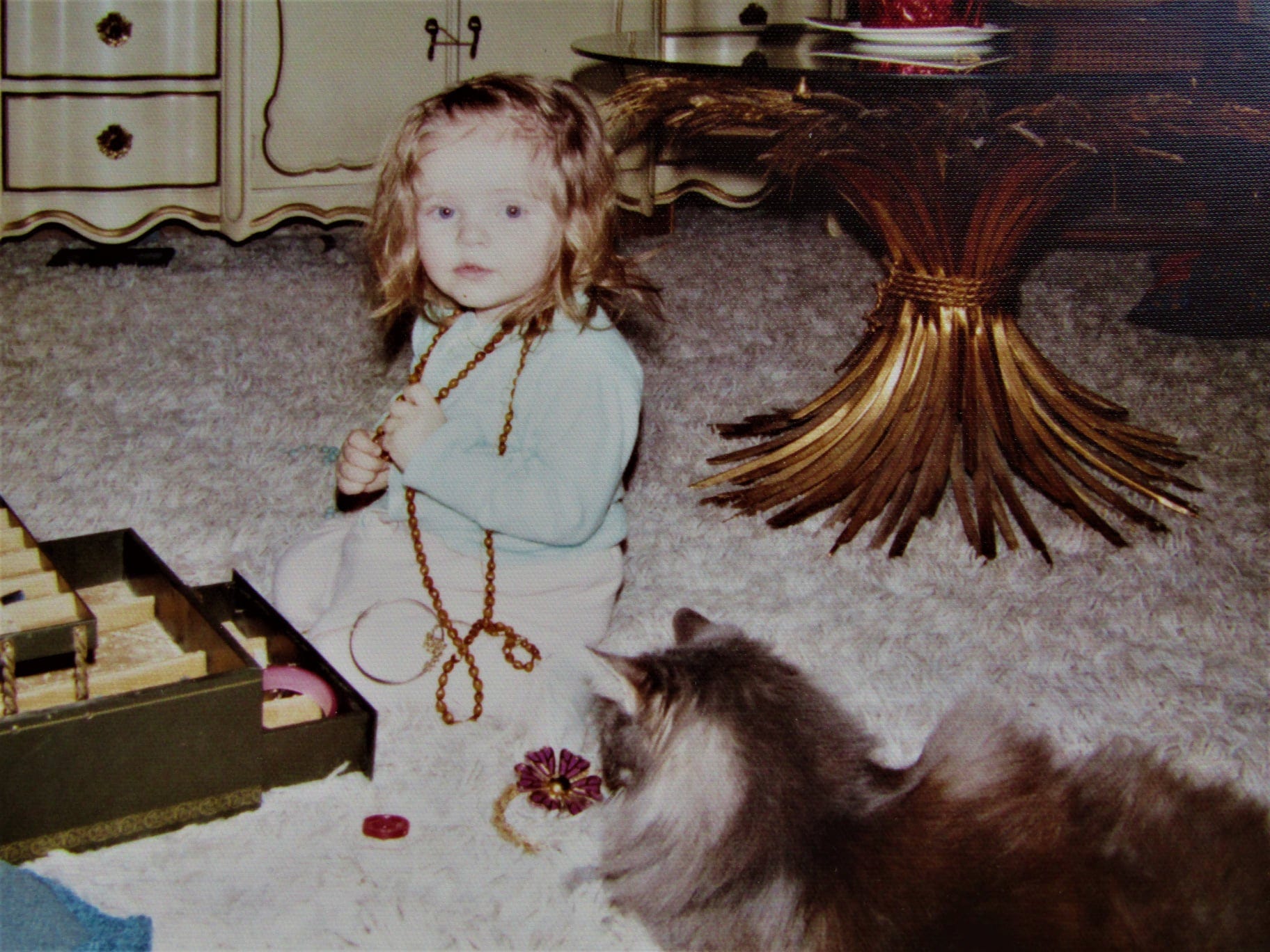 Cat: Moker, sort of fat, always hungry, watches birds, sits on the newspaper when you read it (*apparently she also liked to play dress-up with me or I talked her into it, provided I doled out some Meow Mix)